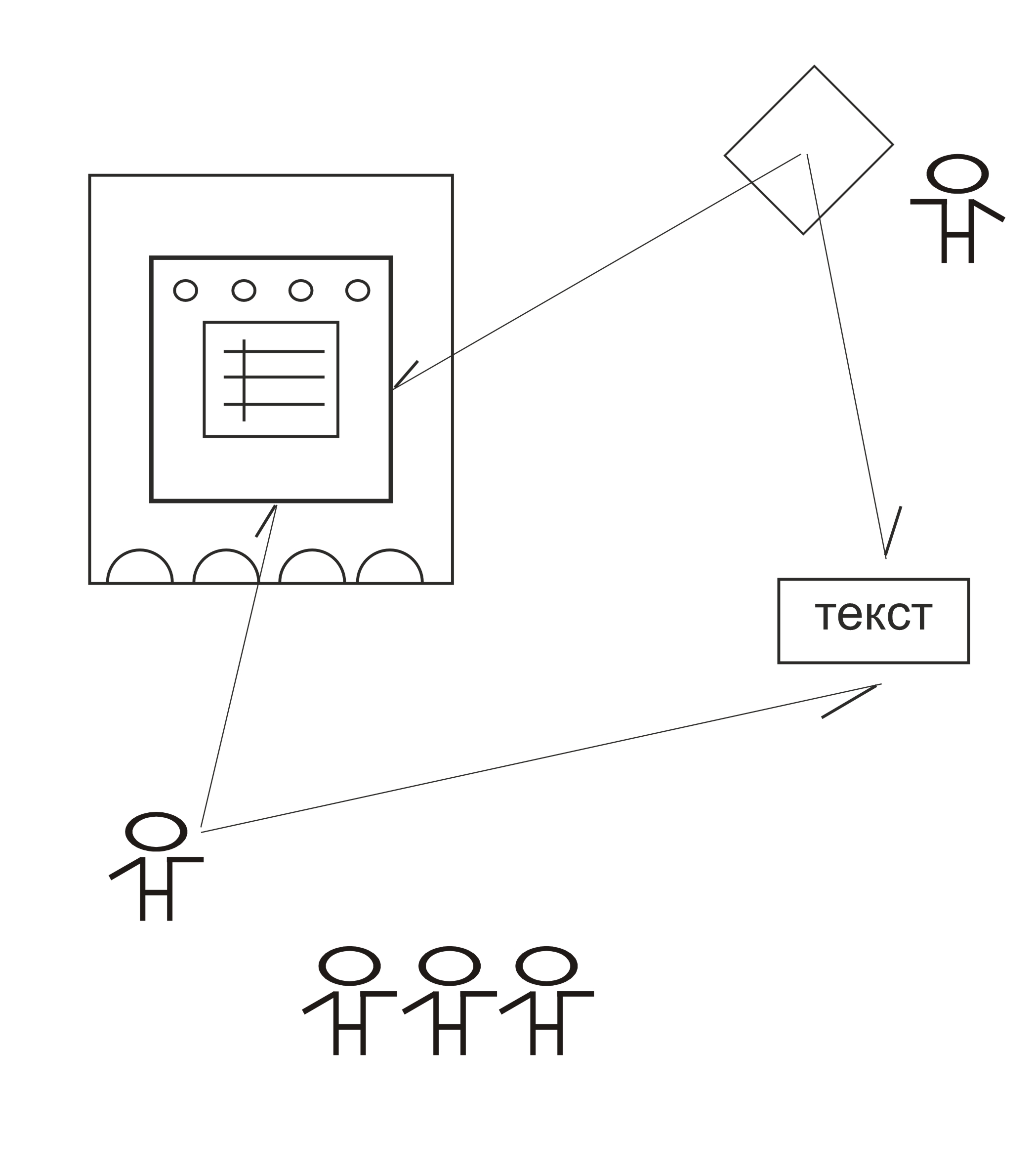 | Но у меня может быть совсем другая задача. Например, я могу ставить перед собой цель с помощью этой схемы организации пространства и на ее базе осуществить определенную организационно управленческую работу, например составить программу исследований и разработок по теории мышления, составить проект этих исследований и разработок, передать ее некоторой совокупности коллективов, распределить работу и практически ее организовать. Я при этом буду точно так же исходить из этой схемы организации пространства, буду ею пользоваться, буду точно так же мыслить. Но это мое мышление будет замкнуто не на коммуникацию, не на общение с вами, а на решение организационно управленческих задач. И тогда эта схема организации пространства будет нами интерпретироваться, пониматься и толковаться совершенно иначе. Тогда ее уже нельзя будет представлять просто как «разборный ящик», в который я помещаю содержания моей рефлексии, ее нельзя будет понимать как некий предел. Ее надо будет понимать совершенно иначе: как схему, скажем, нечто изображающую или нечто проецирующую. И тогда должен появиться совсем другой материал, а именно: вся та компания людей с определенными культурными традициями, умениями, навыками… Например, я могу рассматривать задачу спрограммировать и спроектировать комплексную систему исследований и разработок, захватывающую представителей нескольких наук: логики, социологии, психологии, педагогики, этнографии, культурологии, археологии, например, для разработки теории мышления. Это будет комплексная многопредметная программа. И тогда я эту схему оберну… Я должен буду потом, в соответствии с тем, что в ней получится, чем она будет наполнена, произвести практическое, социотехническое распределение целей и задач. И тогда я должен буду представить эту схему уже не как «разборный ящик», в который я погружаю содержания моего сознания, а как изображение некоторой системы деятельностей, и либо я буду программы подстраивать под возможности этих групп, либо, наоборот, я буду менять эти группы. Но важно, что в этом случае сама эта схема должна пониматься и интерпретироваться иначе. И проработка этой схемы будет иной. И я тогда должен буду осуществлять на базе этой же схемы другие процессы мышления. Это будет уже не чистое мышление, а мышление в более широком контексте: организационно управленческое, программирующее или проектное мышление. Оно будет в контексте тех или иных практических задач, а отнюдь не для коммуникации. |