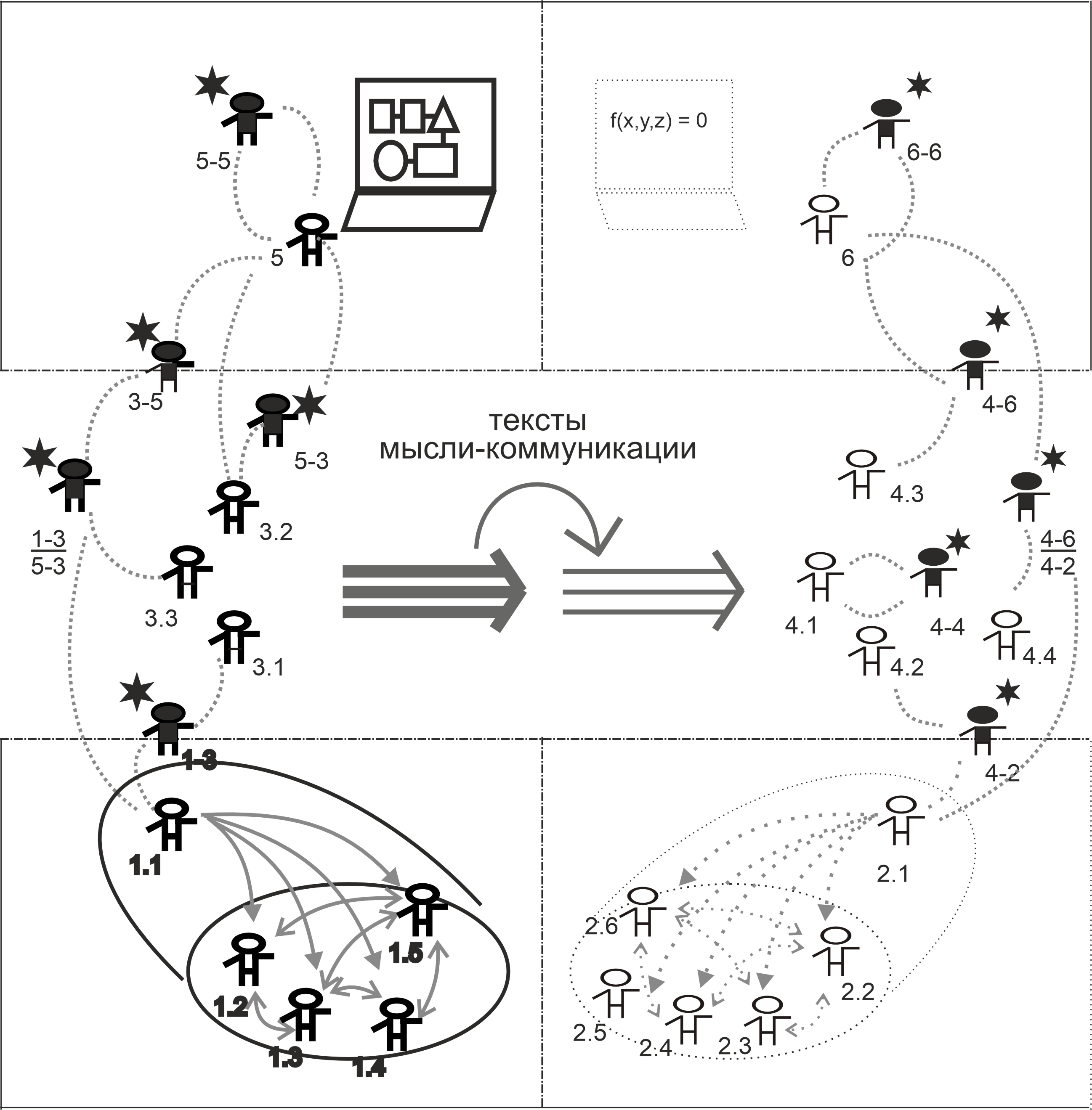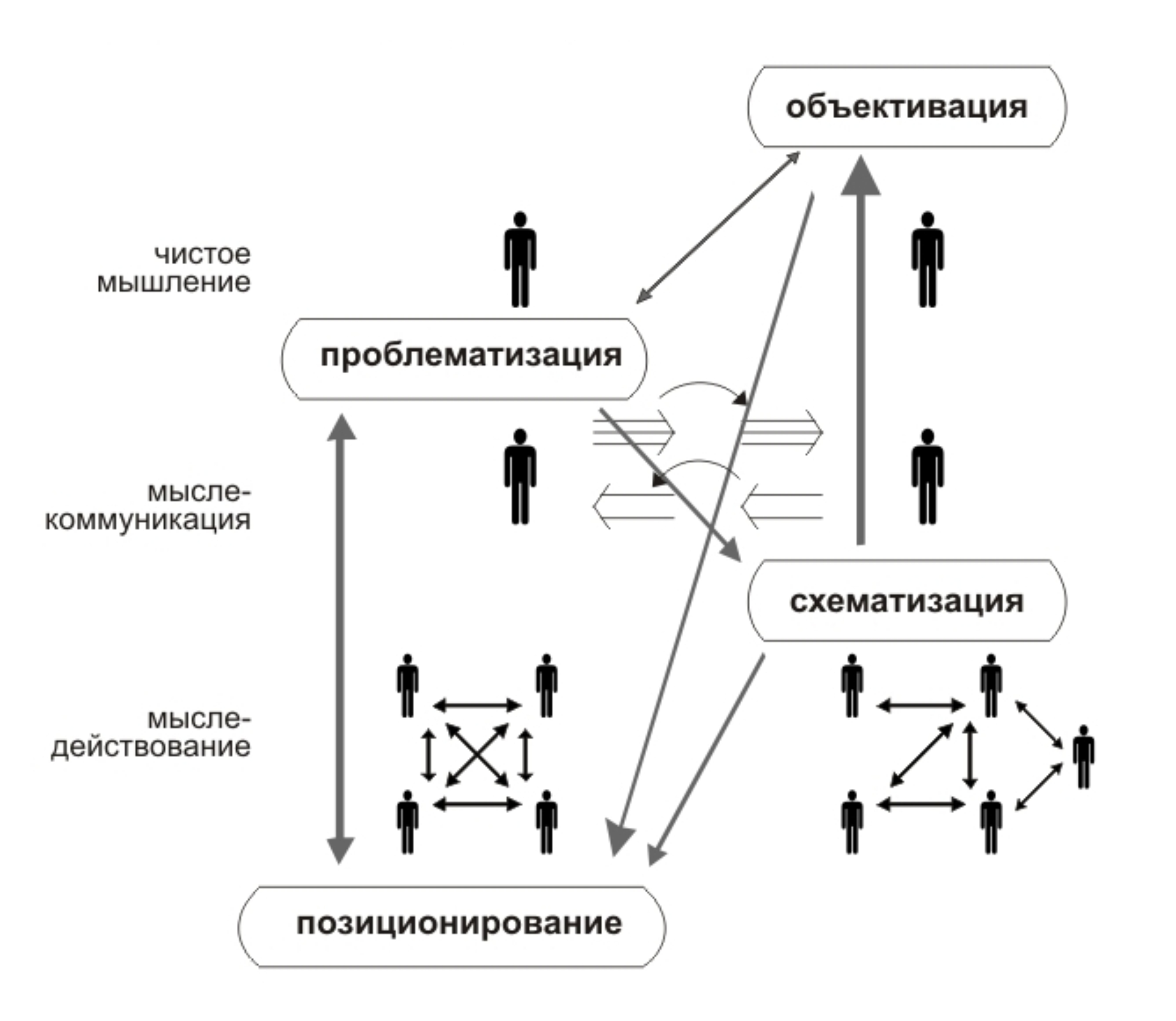 | Прежде моего ответа на данный вопрос, полагаю, что имеет смысл каким-то образом обозначить для себя один из аспектов ситуации с методологией – аспектов, принципиальных не только для Чтений, но для них, если не в первую, то далеко не в последнюю очередь. Из истории ММК известно, что его методологическая схематизация была всегда решением той ситуации, в которой оказывался Кружок. А равно от самоопределения кружковцев в отношении практик во внешних сферах, обстоятельства которых были для Кружка значимыми. К этому необходимо добавить, что уже не одно десятилетие Чтения и подготовка к ним выступают (по известным причинам) одной из (немногих) площадок практикования СМД-методологии. Как и в тезисах к предыдущим Чтениям, я и в этих отмечу характер и атмосферу их подготовки – подготовки в целом и, в частности, мной. Это существенно, тем более что с какого-то момента эта форма семинаров, подготавливающих Чтения, была свернута, что, разумеется, не лучшим образом сказывалось на результатах. Пару лет назад эта практика – как бы фильтрации смысла и содержания, предполагаемого к выносу на Чтения, – была восстановлена. И здесь любопытно сравнение. Сошлюсь на преамбулу к своим тезисам 2025 года. Цитата: «…в письменной рассылке Фонда на конец сентября числилось уже порядка 10 заявителей. Обобщая, можно сказать, что таким образом ими выражается "тоска" по ОДИ. И сами семинары, подготавливающие Чтения, и сами Чтения с моей точки зрения все более уподобляются коммуникационным сюжетам Игры. Заявители докладов полагают, что они тем самым компенсируют коммуникационный дефицит своих частных практик…». Сравним с декабрем 2026 года. Сошлюсь на почтовые, e-mail, уведомления от администраторов Фонда, они же – организаторы и модераторы подготовительных семинаров и самих Чтений. Третью неделю уведомлений нет, следовательно нет и подготовительных семинаров. Это значит, что нет новых заявок на доклады. Это, если по аналогии с 2025 годом, также означает дефицит практик, которыми можно и нужно поделиться с миром. Отличие в том, что накануне дефицитом была практика (мысли-)коммуникации, то ныне – практика (мысле)действования. Вместе с 2025 годом, как я полагаю, проблема заключается во вхождении эмпирических индивидуумов в схему МД, что равносильно их включенности в эмпирическую МД. Проблема не только не ставится и не решается, но и оказывается все менее поддающейся решению. Поскольку рамкой для предстоящих Чтений остается идея и схема мыследеятельности, и поскольку в центр тезисов к предыдущим Чтениям, повторю, ставилась проблема вхождения эмпирического индивидуума в пространство мыследеятельности, и поскольку данная проблема далека от решения мною, постольку я продолжу размышлять над ней и в этих тезисах. В чем должно состоять отличие видения данной проблемы в тезисах к теме 2025 года «Коммуникация» от тезисов к теме «Мыследействование» 2026-го? Понятно, что следует поменять на нее угол и точку зрения. Общим для тех и других тезисов служит понимание дефицита индивидуальных средств для вхождения. |