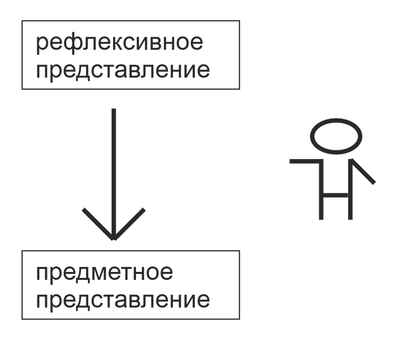 Тогда мы будем очень четко разделять все его утверждения, все принципы на рефлексивный план, с одной стороны, и на предметный план, с другой стороны. И я утверждаю, что нет и не может быть никакой культурно значимой концепции, в которой бы вот так не соединялись эти два момента. Для того чтобы эта картинка была правильной, я бы нарисовал это иначе. Я пока ввел эти два представления как бы механически: вот есть одно – рефлексивное, есть другое – предметное (см. рис. 2а). Их надо разделять, класть как бы порознь. Так я сказал раньше. А теперь я сделаю иную вещь: я буду каждый раз рисовать рефлективное представление как объемлющее, а предметное – как включенное в него (см. рис. 3). |