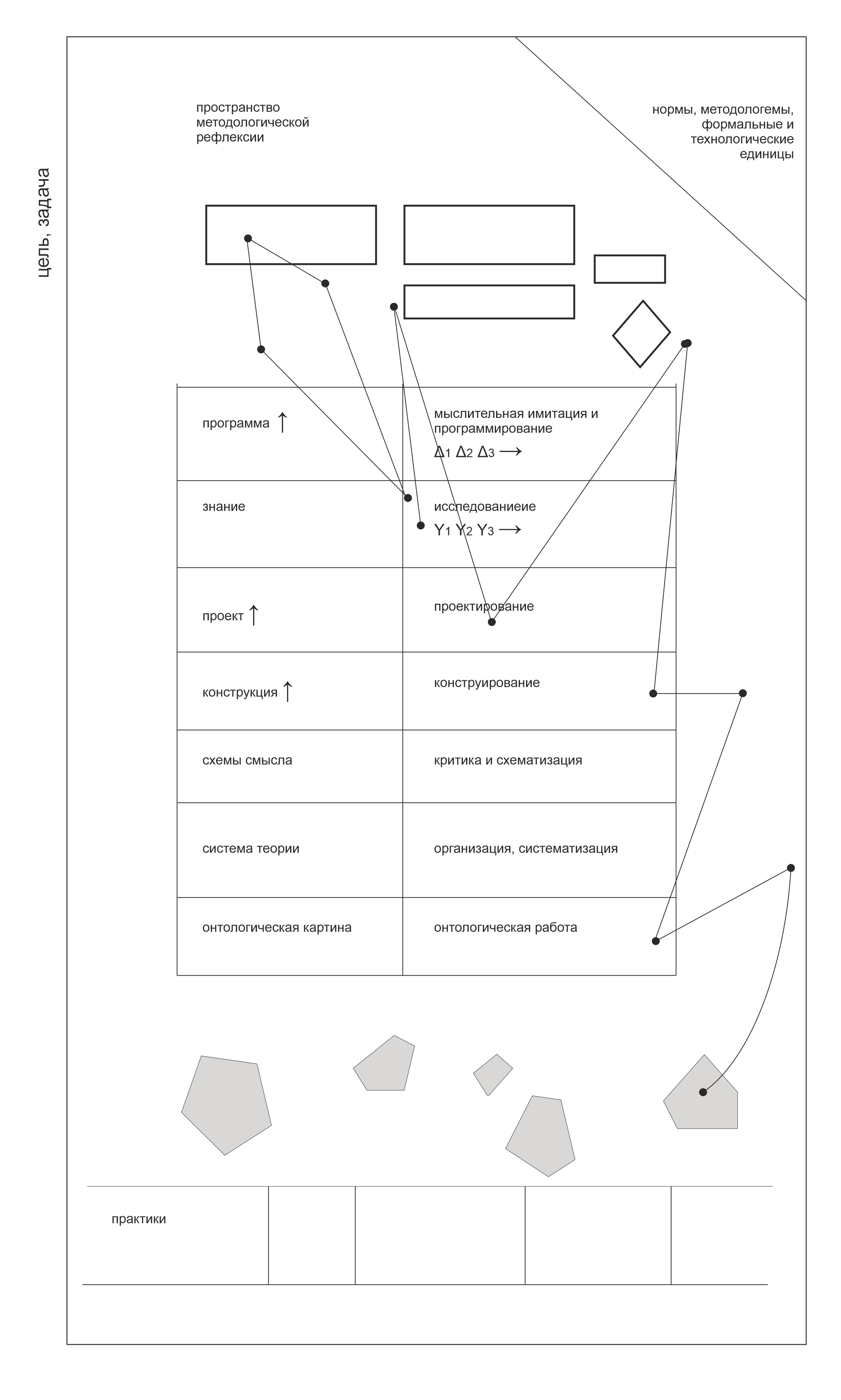 В прошлый раз, реализуя основные принципы деятельностного, или мыслительно деятельностного, подхода, я нарисовал схему (см. рис. 4) и назвал ее схемой, задающей пространство методологической работы и таким образом организующей (именно через схему пространства) мое мышление и деятельность или вообще мышление и деятельность методолога. |