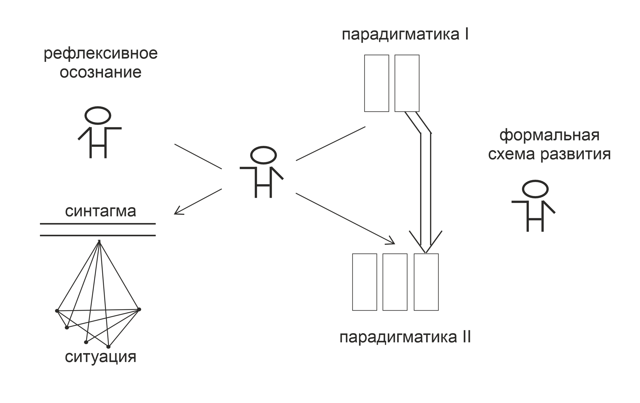 | 1. На уровне непосредственного восприятия и практики общения «мышление» существует в виде бесконечного множества отдельных актов мысли и создаваемых ими организованностей – знаний, моделей, фактов, проблем, категорий и т. п. Каждый такой акт и каждая организованность представляют собой самостоятельное явление, и все они настолько отличаются друг от друга как в содержании, так и в форме, что нет и не может быть никакой среднетипической модели, которая могла бы рассматриваться как образец мышления. Но что тогда позволяет нам относить все эти явления к «мышлению»? И что мы имеем в виду, когда говорим о «мышлении»? Попытки ответить на этот вопрос привели в конце концов к специфическим схемам, объединяющим «синтагматические цепочки» и «парадигматические системы». Лингвистика проложила здесь путь, и он дался ей нелегко, но сейчас наступило время, когда эти схемы стали использовать также при описании мышления, и было понятно, что таким образом устроено все, что принадлежит к человеческой деятельности. Разрешив одну проблему, схема «синтагматика – парадигматика» породила ряд других. Как соединить эту схему устройства объекта с представлениями об историческом развитии мышления? Каждый синтагматический акт и каждая синтагматическая организованность лишь осуществляются, реализуя одну или несколько парадигматических форм; они в принципе не могут развиваться и порождать новые синтагматические и парадигматические организованности. |