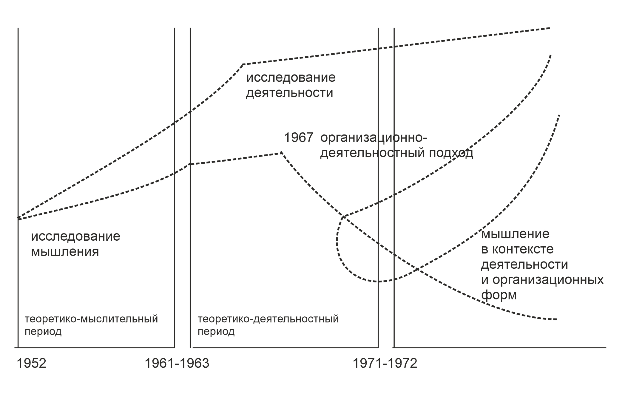 Первый период, начиная с 1952 года, может быть в общем и целом охарактеризован как период теоретико мыслительных исследований, или исследований по содержательно генетической логике, хотя идея содержательно генетической логики и сам этот термин возникли не в 1952 году, а в 1958-1959 годах. Второй период, который начинался с 1960-1963 годов, – это был большой перелом и продолжался до 1971-1972 годов – может быть назван теоретико деятельностным. Третий период начался в 1971-1972 годах и связан с появлением такого понятия как организационно деятельностный подход, и это понятие является сейчас для нас основным. Теперь я поясню графику схемы (см. рис.1). |