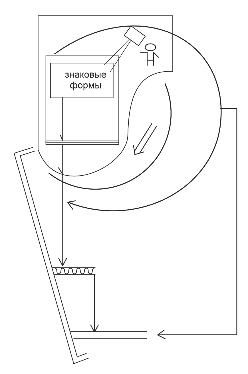 | И теперь давайте это обсуждать. Практически я сейчас реализую схему многих отражающих зеркал Владимира Лефевра. Мне только нужны не самоотражающиеся зеркала (Лефевр фиксировал феноменологию процессов рефлексии), а мне нужно зеркало с особой функцией. И, собственно, роль этого зеркала с особой функцией и могло бы выполнять сознание. Это сознание все время поворачивается, а отношение отражения и интендирования является одним – двусторонним – отношением, хотя оно потом может растягиваться в два… Вот я повернулся в левый угол и отразил то, что есть там, теперь я повернулся в правый угол, и то, что было там, у меня исчезло, и я отражаю нечто другое. Теперь наделите еще это вращающееся зеркало, или экран, функцией проецировать, или переносить с одного на другое. Представьте себе, что у вас есть еще блок накопитель, блок памяти, куда все время складываются копии и могут оттуда извлекаться. Тюков: То есть это не гербартовская «масса»? Отнюдь. Это – чистое зеркало, вращающийся экран. И он снимает и отбрасывает, снова снимает и снова отбрасывает. Он все время перебрасывает эти образы. Кроме этого, чтобы сделать это уже совсем правдоподобным и соответствующим работе восприятия и представления, введите сюда, что отраженный образ с этого экрана после каждого такта стирается. И, кстати, все это так у нас, по видимому, и устроено… |